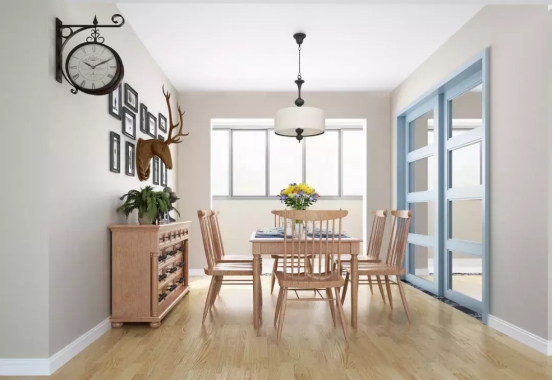 餐桌正上方用带灯罩的吊灯,吊灯距离桌面70~80cm高就好,灯光可以稍亮一些,让菜肴显得更可口。
