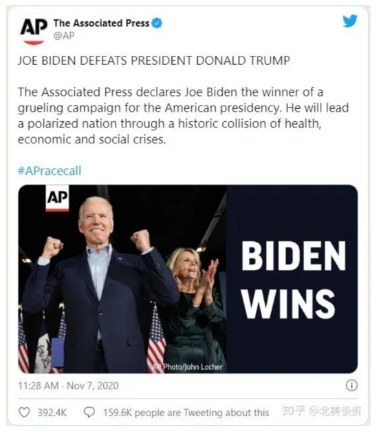 美国东部时间,2020年11月7日,星期六上午11:28分,美联社在推特上正式宣布拜登击败特朗普,成为2020年美国总统竞选中的赢家。