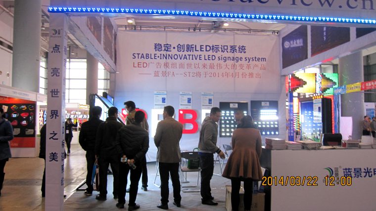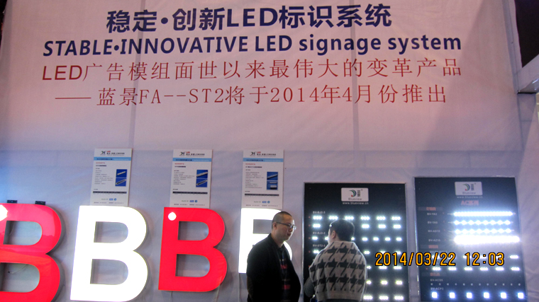 我司在展会上重点向客户展出了今年的创新之作:AC长条系列——主要应用于8-20CM厚的单面灯箱照明解决方案, YD7三星长条系列——主要应用于6-18CM厚的单面灯箱解决方案,AZ10三星侧光源——主要应用于10-25CM厚度的双面灯箱照明应用,AC模组系列——主要应用于6-18CM厚的标识字照明解决方案,CQ5全彩逐点扫描模组——主要应用在星级酒店、KTV、休闲会所、有七彩变换要求的标识照明、室外建筑装饰装修光源。这些产品均是2014年我司推出的精品,以其易安装,低成本,稳定性强,光效一致性好等众多优点,并含盖了标识照明应用领域的各个环节,成为整个展会的亮点,并得到了广大客户的一致认可和称赞。