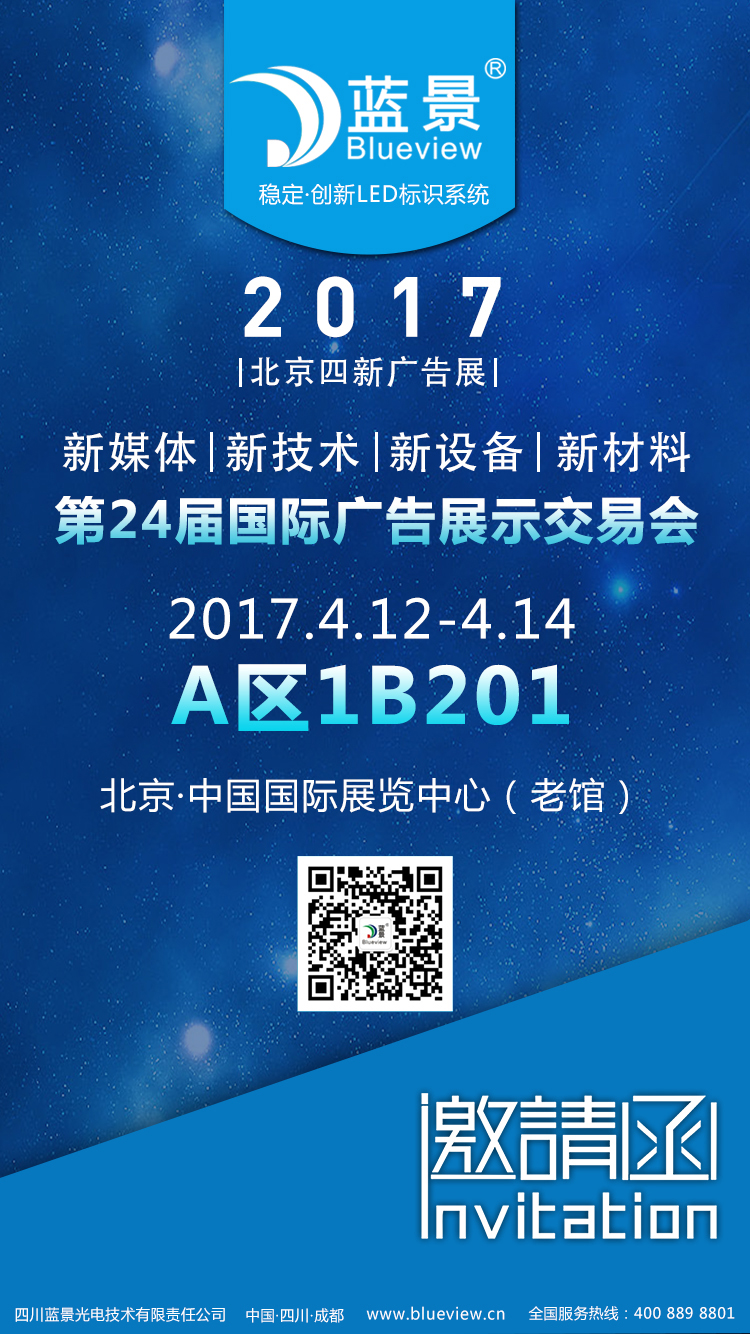 2017年第二十四届国际广告四新展将于4月12-14日,北京·中国国际展览中心(老馆)隆重开幕!高精密光纤激光切割机·迷你字加工中心·激光打标机·弯字机·喷墨打印机·数码印花机·写真机·多款迷你字·标识·灯箱·光源·显示屏,更多行业知名品牌产品汇聚于此。 四川蓝景光电技术有限责任公司展位号位于A区1B201,欢迎新老客户莅临展位。 中国国际展览中心