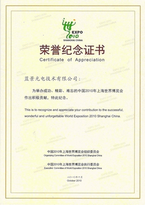 四川蓝景光电技术有限责任公司非常荣幸的获得这一荣誉,荣誉证书背后饱藏的是四川蓝景光电技术有限责任公司广大干部职工付出的汗水与智慧。 自2006年起的近4年时间里,四川蓝景光电技术有限责任公司参与了世博筹办工作, 充分发挥了国家LED照明行业节能环保支柱单位的作用。在世博筹建过程中,分批次地为2010 上海世博会提供了5050防水模组、小铝槽防水模组及LED环形灯三种LED产品, 在为期半年的2010年上海世博会期间,四川蓝景光电技术有限责任公司攻克各种难题、种种困难, 不但确保了世博照明的正常运行还在正常照明使用上为国家节能了30%以上的能源,向世界展示了中国节能环保的应用水平,也充分彰显了中国照明节能技术实力和蓝景人的敬业风采。