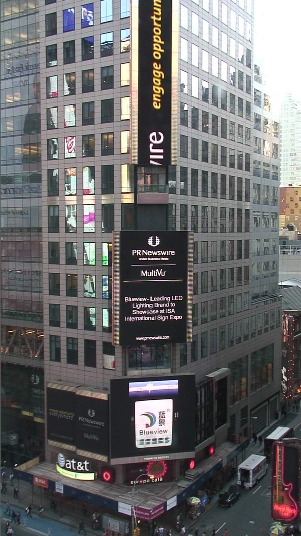 纽约时代广场是全世界最繁华的商业中心和娱乐中心,每天人流量多达几十万,被称为“世界的十字路口”,在这里亮相一直被视为进入全球市场和知名品牌的象征 。美通社在北美发布蓝景光电参加ISA展新闻稿的同时,也把蓝景品牌推上了纽约时代广场最耀眼的位置。短短两天时间,蓝景光电及蓝景光电第5次参加美国1SA国际广告展的消息,受到全球320多家媒体和网站的广泛关注。