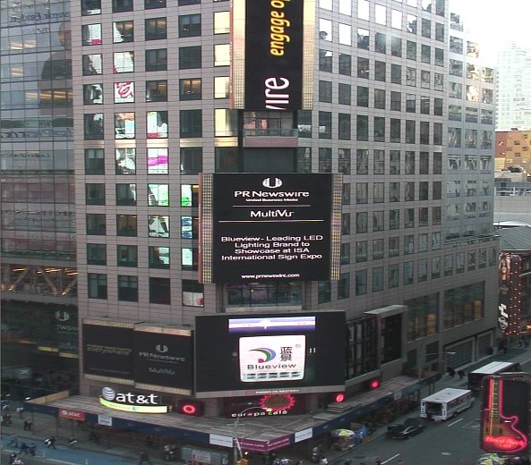 纽约时代广场是全世界最繁华的商业中心和娱乐中心,每天人流量多达几十万,被称为“世界的十字路口”,在这里亮相一直被视为进入全球市场和知名品牌的象征 。美通社在北美发布蓝景光电参加ISA展新闻稿的同时,也把蓝景品牌推上了纽约时代广场最耀眼的位置。短短两天时间,蓝景光电及蓝景光电第5次参加美国ISA国际广告展的消息,受到全球320多家媒体和网站的广泛关注。