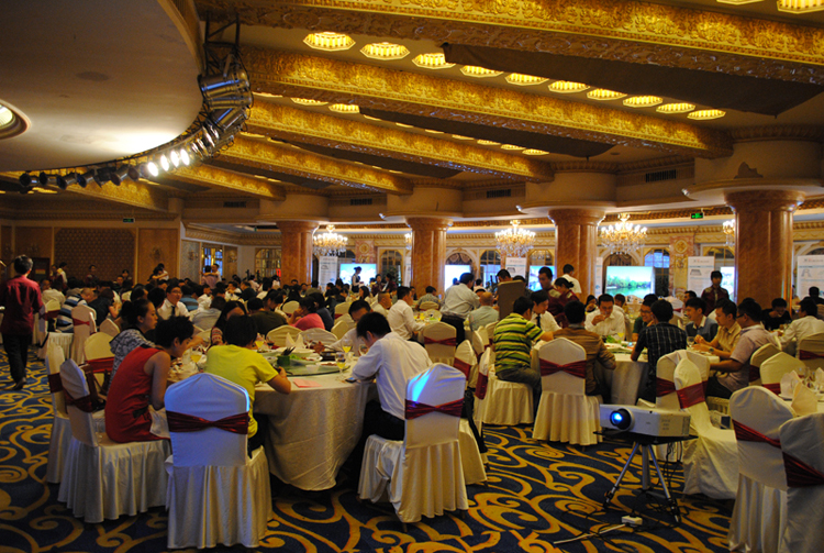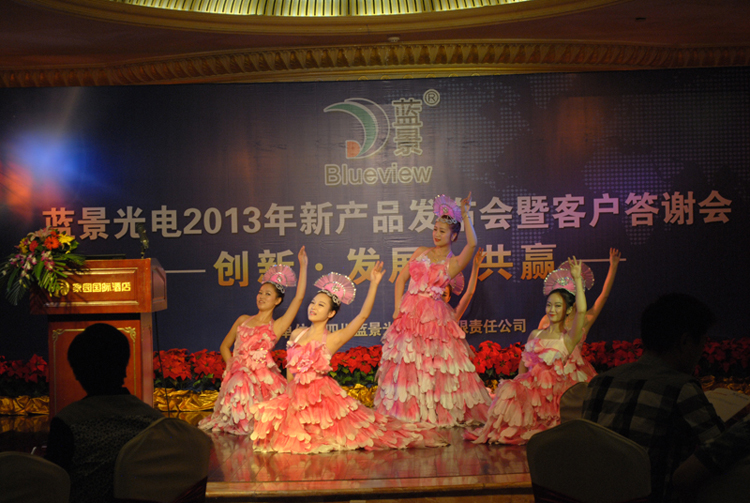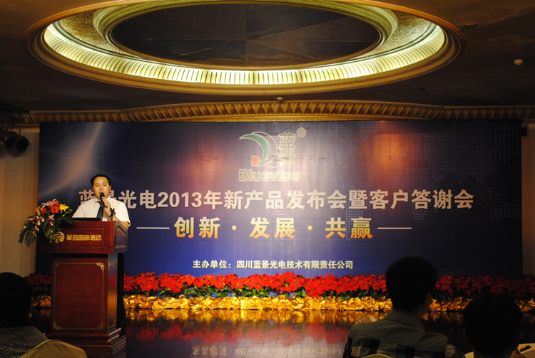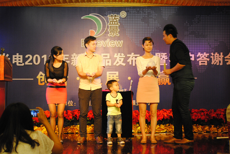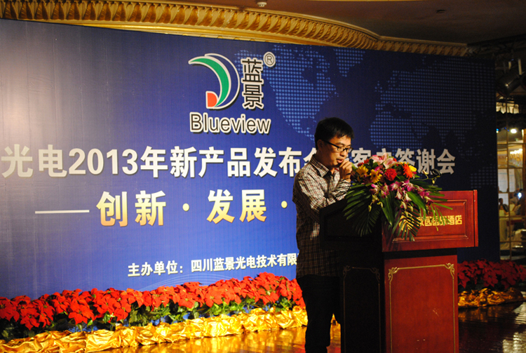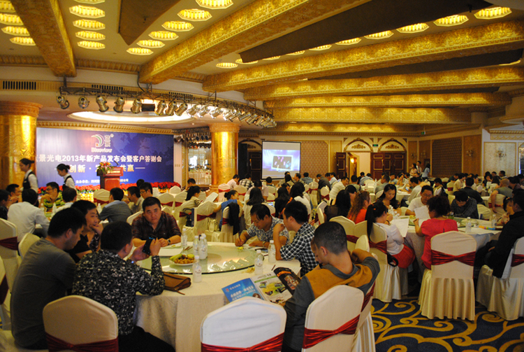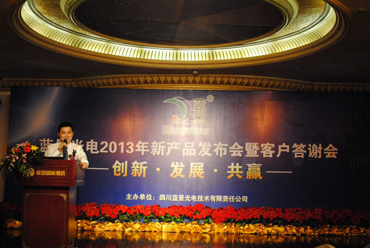 10月12日下午三点,五星豪华的家园酒店会议室内金碧辉煌,鲜花锦簇。来自川渝地区的240多名嘉宾济济一堂,“蓝景光电2013新产品发布会及客户答谢会”在这里隆重召开。公司国内销售总经理张文高先生、技术支持刘凡忠先生做了精彩发言,并分别对新产品和售后服务做了详细介绍。客户代表佛山逸扬广告唐总及媒体代表《中国标识》尤总编作了激情演讲。嘉宾就会议中的相关问题进行了现场提问,并在现场亲自体验了新产品AC LED YA6-1014灯条、LED SMD 2835等树脂字系列的展示效果。