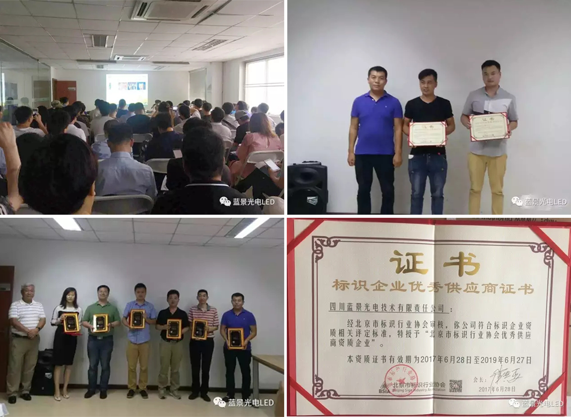 7月6日下午,2017年度第二次会员标识技术培训暨标识企业资质证书颁发仪式顺利拉开帷幕,下午15点半左右,北京标协就首批获得资质的企业进行公示,并现场颁发资质证书。据悉,首批北京标协会员企业资质评定从筹备到评定整整耗时半年,北京标协联合多家第三方权威机构对报名企业进行审核、实地调研、审慎评选,最后最终结果,四川蓝景光电技术有限责任公司荣获“标识企业优秀供应商证书”,LED标识光源企业仅此一家荣获此荣誉,能成为北京协会的优秀供应商,是一件非常了不起的事情,我们应该为此感到自豪。