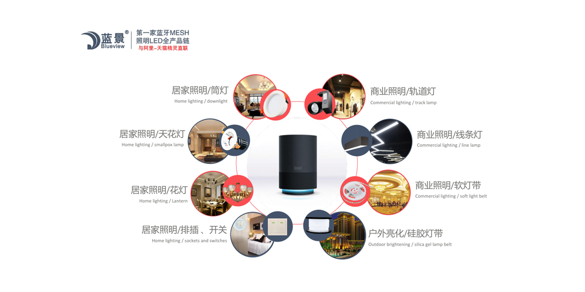 在此基础上四川蓝景光电技术有限责任公司(以下简称蓝景)与上游厂商微智电子战略合作,基于蓝牙mesh技术和天猫精灵直连为中心点,开发了一系列产品类型,形成了一套蓝景独有的LED智能照明生态链。