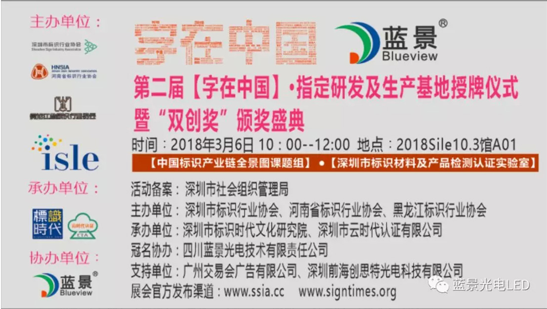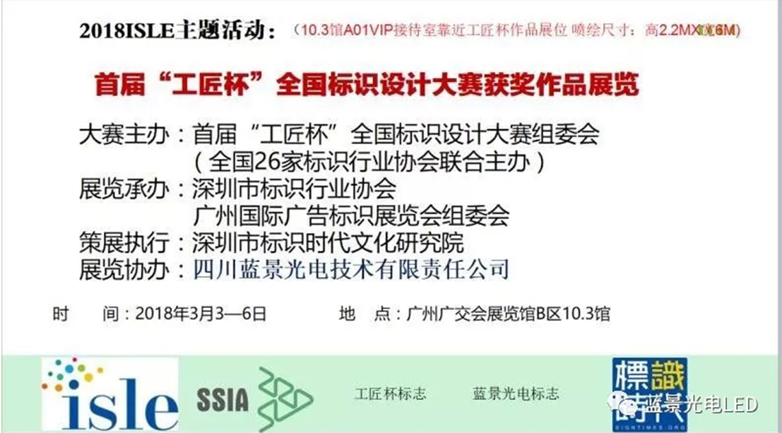 1、在展会同期,由蓝景协办的“第二届【字在中国】-指定研发及生产基地授牌仪式暨'双创奖'颁奖仪式”及“首届‘工匠杯’全国标识设计大赛获奖作品展览”两项活动在展会现场举办,邀请广大客户参与。