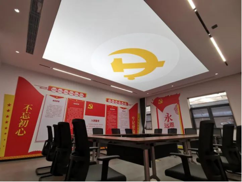 前厅部分磁吸灯具也采用可调角度,方便场景需求使用。整体空间照明采用天花拉膜,内藏智能灯条,由于培训室需要的灯光模式较多,均采用蓝景智能控制系统进行灯光的控制。