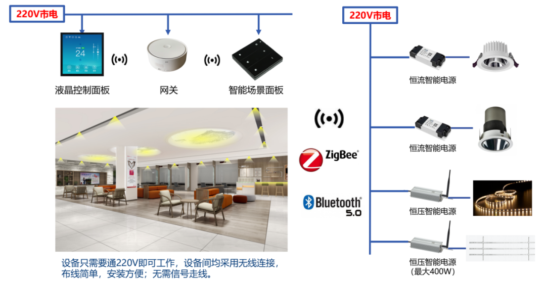 室内照明基本采用无线的ZIGBEE、蓝牙MESH。无线类型的所有设备只需要通220V即可工作,设备间均采用无线连接,布线简单,安装方便;无需信号走线(特别是替换项目,根本无法布信号线),无线方案才是首选。
