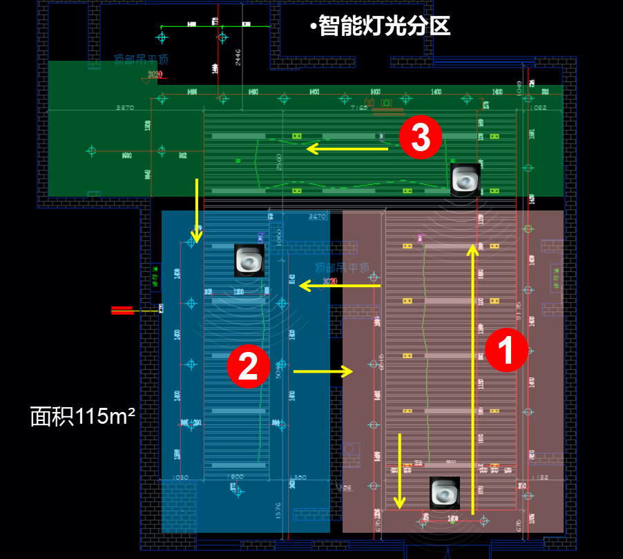 区域2、区域3采用的是人体感应模式:即人来灯亮(100%)、人走灯暗(30%)。